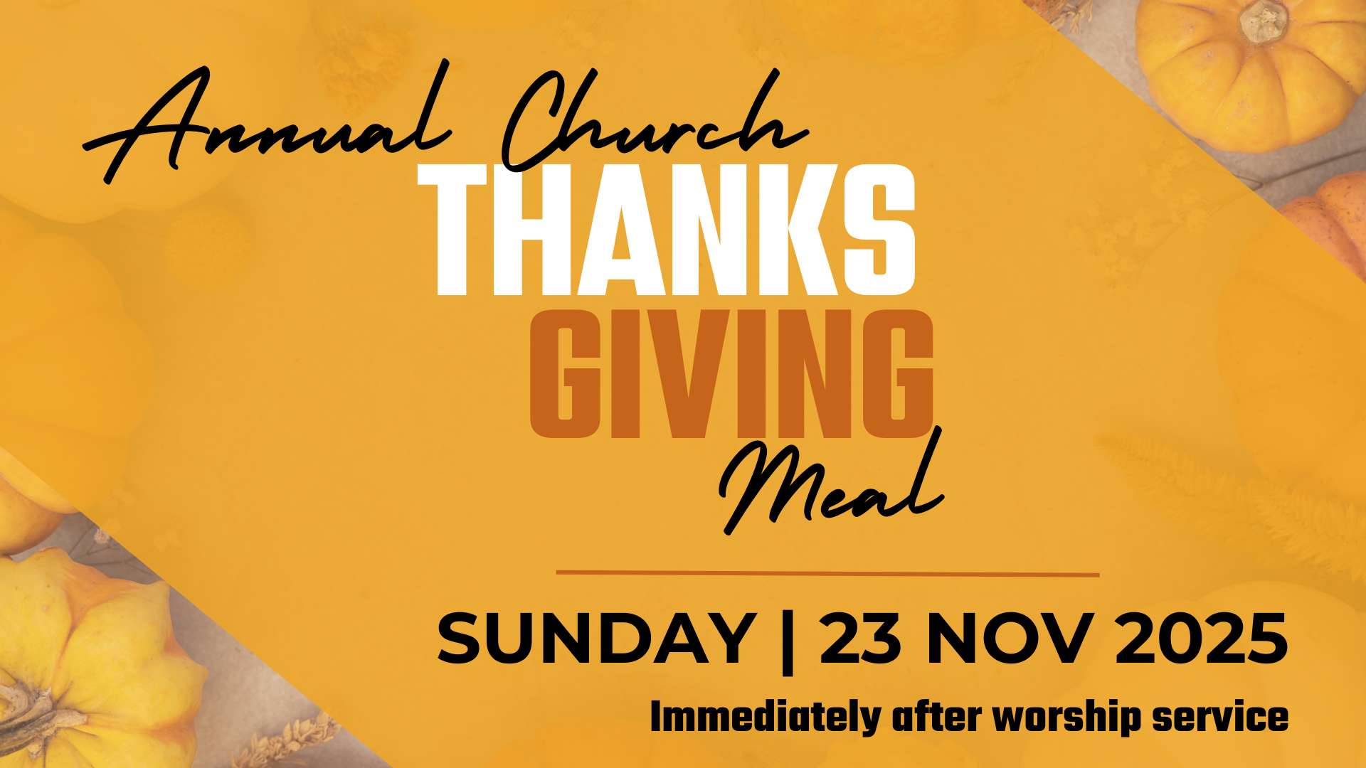 Our church will hold its annual Thanksgiving potluck meal right after the worship service on Sunday, November 23rd. The church will supply turkey and mashed potatoes, and everyone is welcome to bring a dish. Please sign up at the Welcome Center if you plan to attend.
