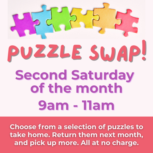 Puzzle Swap is FREE and held each second Saturday of the month. You can choose from a selectin of puzzles to take home. Then return them the next month, and pick up more. There is no charge. Puzzles are availabe for all ages and abilities.